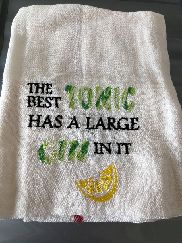 Add some humor to your kitchen with this Embroidered Cotton Tea Towel featuring the hilarious saying "the best tonic has a large GIN in it".