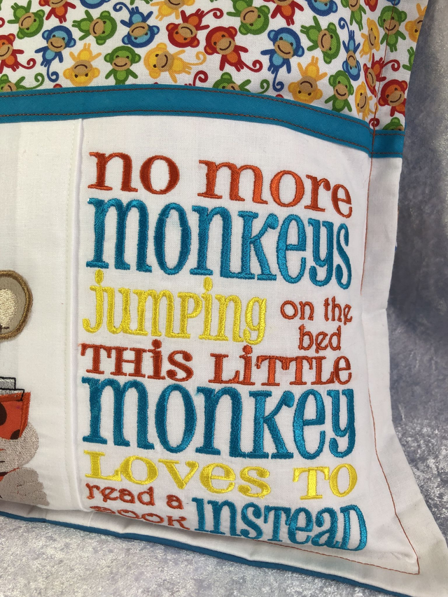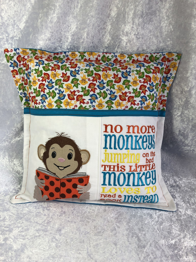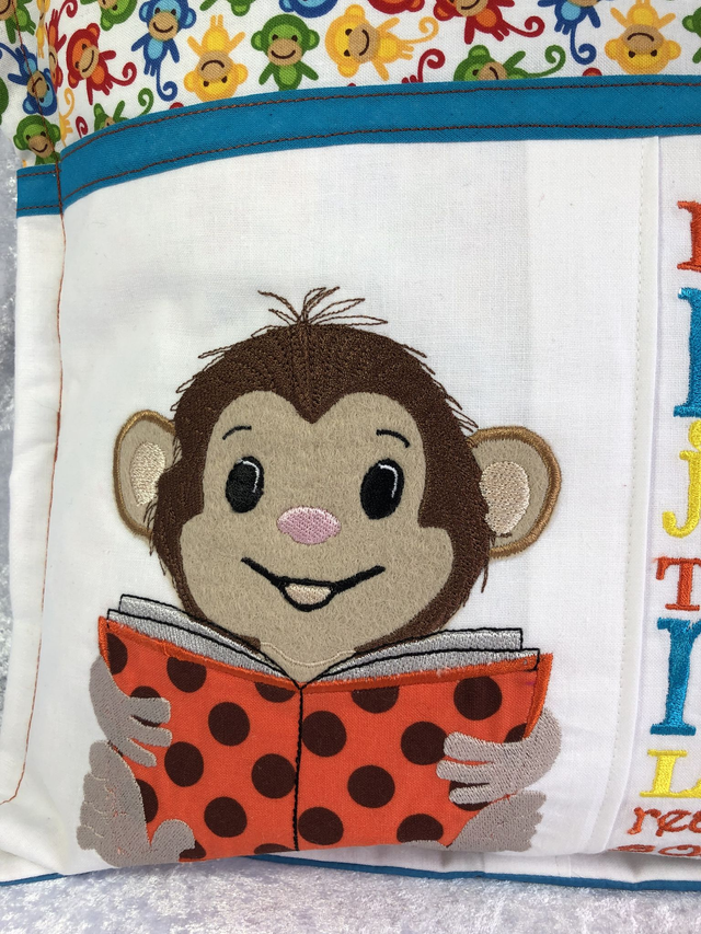 Monkey Reading Book Cushion with embroidered pocket & Free bookmark with embroidered name