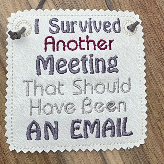 Looking for an amusing yet functional addition to your office or home decor? Check out our hanging sign with an embroidered "I Survived Another Meeting" slogan! Made with high-quality faux leather and a durable leather cord, this door hanger brings a touch of humor to any space. With its stylish design and practical use, it's the perfect gift for a colleague, friend, or loved one. Place it on your office door or bedroom door to let others know you've made it through yet another day unscathed. Order your funny sign today and enjoy the laughs it brings!